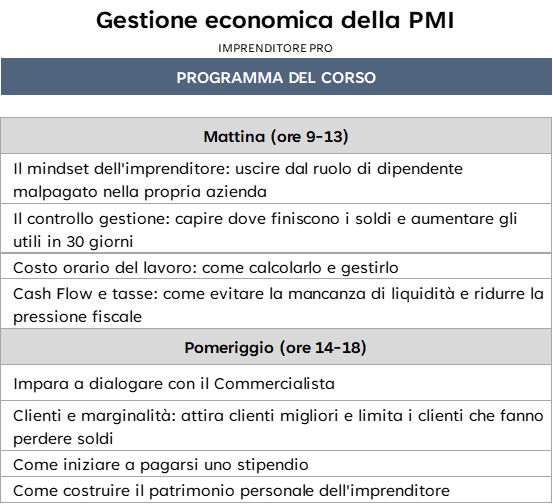Gestire un'impresa, oggi, non richiede solo competenza tecniche: richiede visione imprenditoriale, capacità di leggere i numeri, organizzare il lavoro, controllare i costi, scegliere i clienti giusti e costruire il proprio patrimonio.